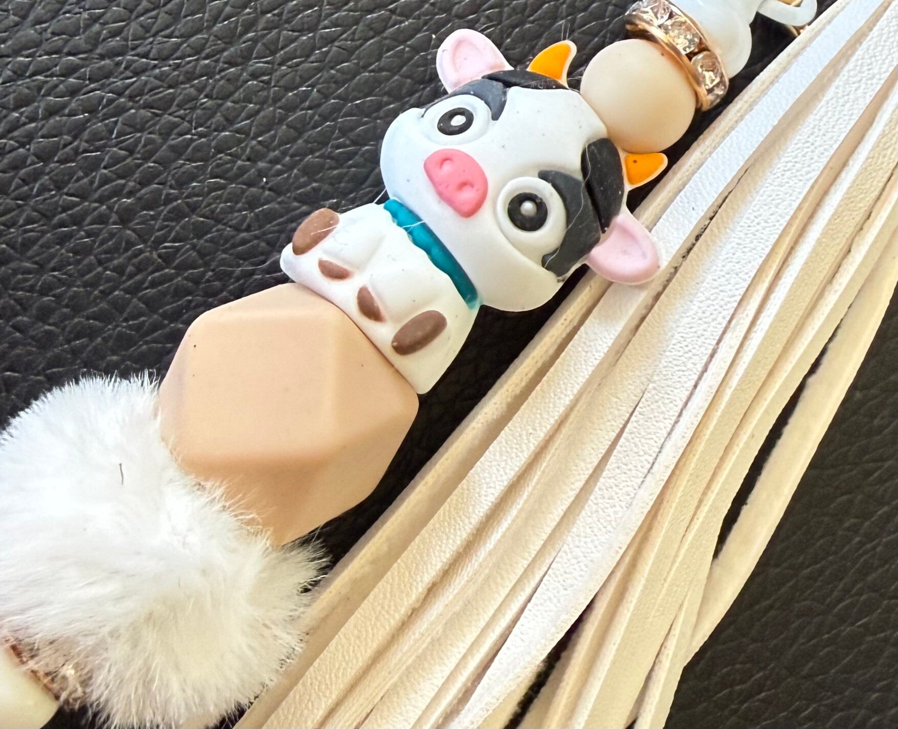 Il se compose d’une adorable figurine de petit poney aux détails soignés, accompagnée de perles dans des tons dorés, beiges et nacrés pour une touche chic. Une jolie licorne suspendue apporte une note féerique et colorée. L’ensemble est sublimé par un long pompon en simili cuir marron, très tendance.