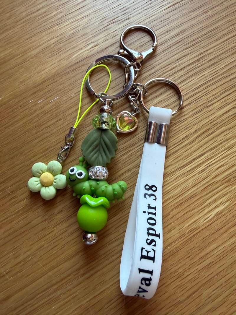 Ce modèle unique se compose d’un adorable caméléon vert aux détails soignés, accompagné de perles décoratives dans des tons verts, bleus et jaunes. Il est agrémenté d’une lanière tressée élégante, d’un pompon tout doux vert vif, ainsi que de petites breloques (fleur et pompon jaune) qui apportent du charme et du mouvement.