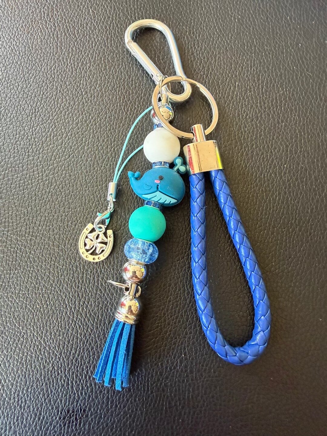 Porte-clés aux tons doux et apaisants, composé d’une adorable petite baleine bleue, de perles assorties et d’un pompon blanc élégant. Une breloque fantaisie vient compléter ce modèle délicat.