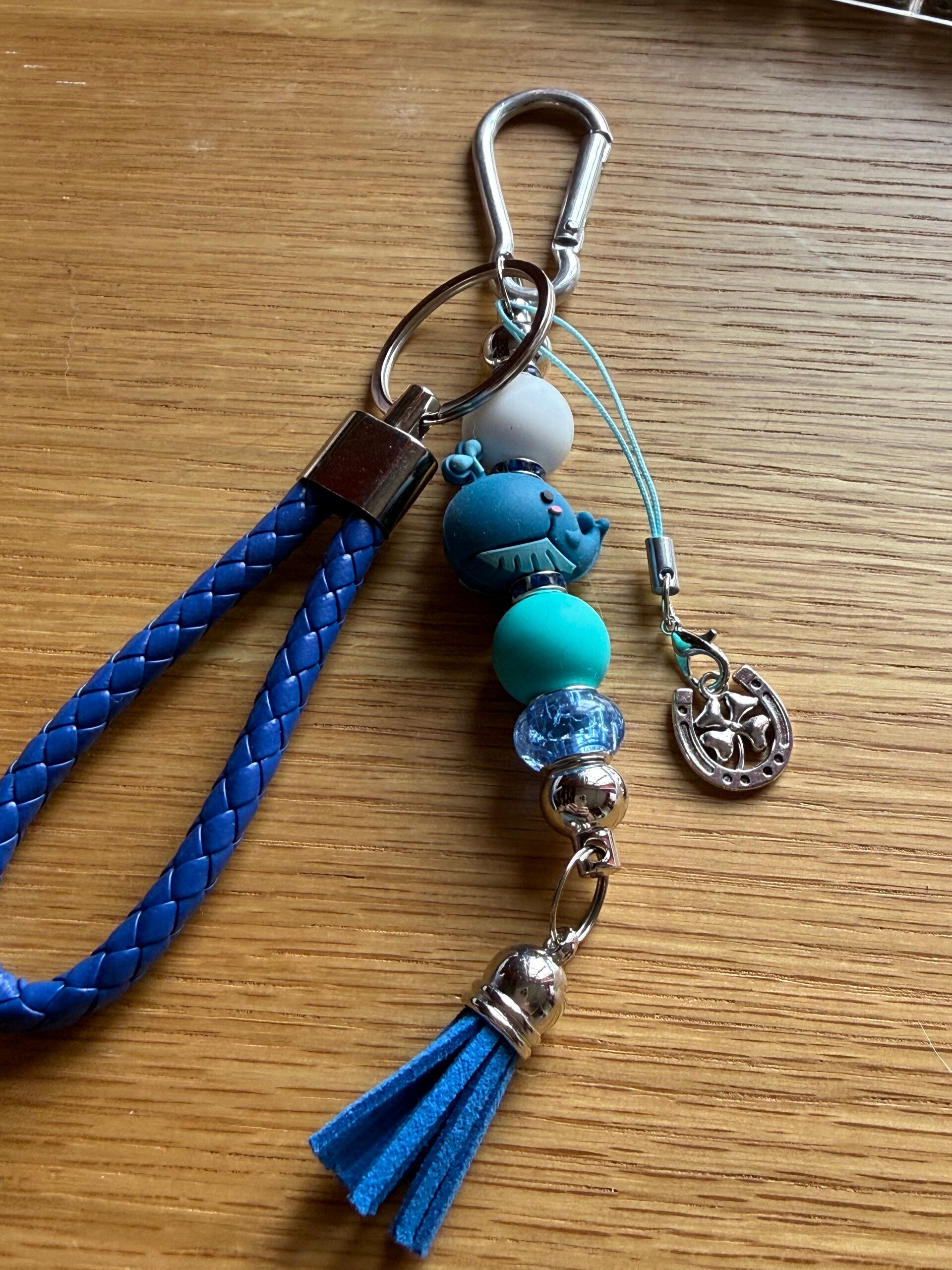 Un joli porte-clés dans des tons bleus avec une baleine amusante, des perles brillantes et une dragonne tressée pour une meilleure prise en main.