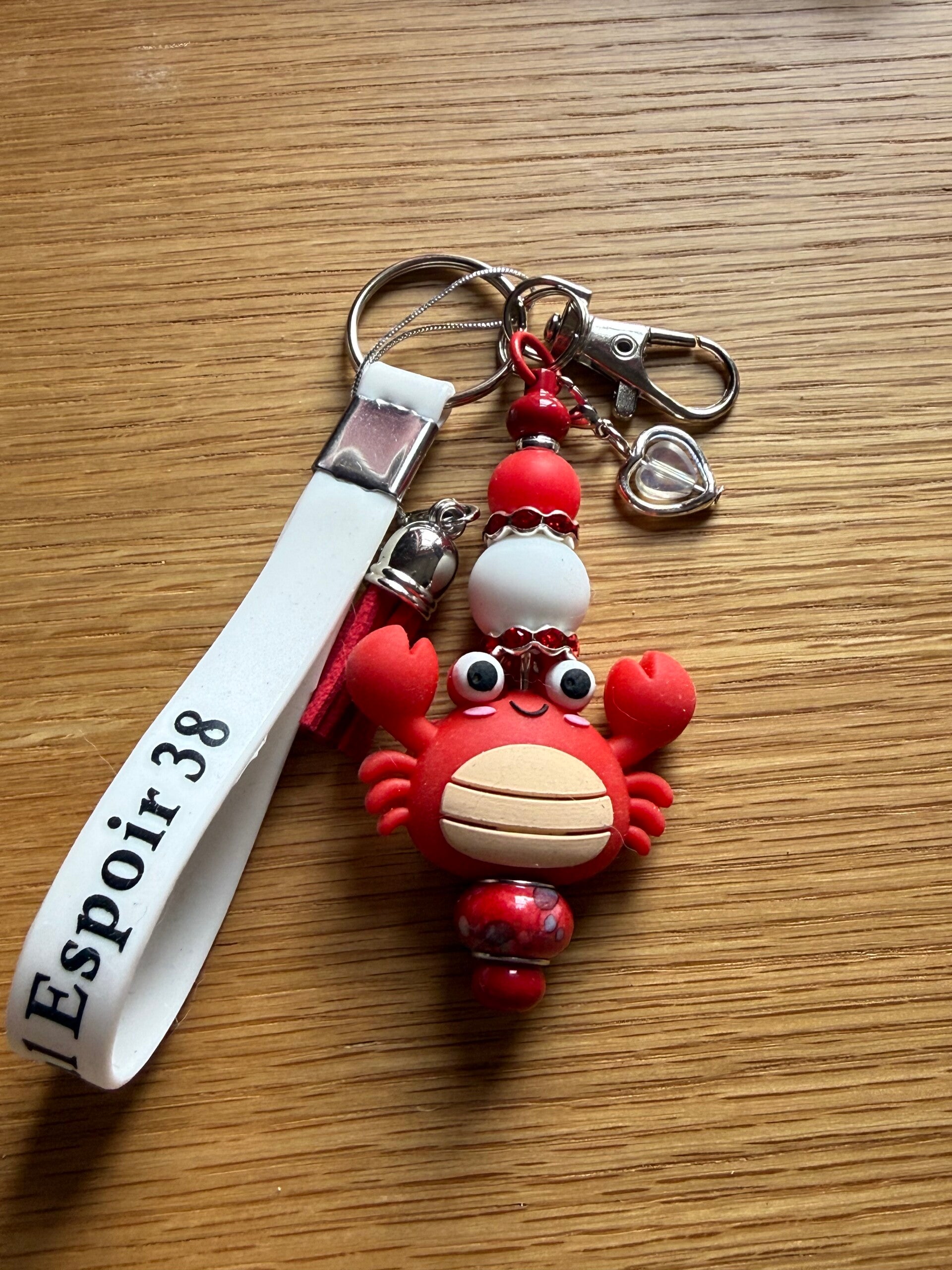 Un modèle fun et plein de pep’s avec un crabe rouge souriant, des perles assorties et une petite breloque cœur.
